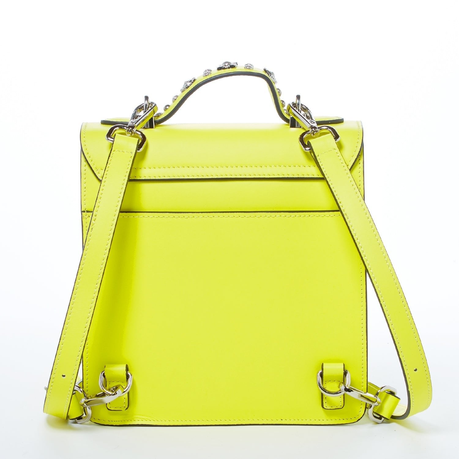 The signature SUSU Hollywood design now comes in the form of a chic fashion backpack! Featuring a boxy, structured shape complemented by comfortable adjustable straps, this top handle bag is a game changer. The adjustable straps not only move with you for your comfort, they also make this bag convertible, allowing it to be worn as a crossbody for when your hands are busy texting or a shoulder bag to change up the look! Secured by a polished silver metal push lock on the front flap, a spacious interior with one zipper and one pouch pocket and a designated exterior back pocket, This yellow leather backpack purse allows you to stylishly take on the day with the feeling that all your belongings are safe. With carefully selected silver appliqués sitting atop a unique chartreuse yellow, this bag is sure to set you apart from the rest. You’ll be charmed when you see this backpack in person and admire the way the appliqués pop against the leather and shine in the light.