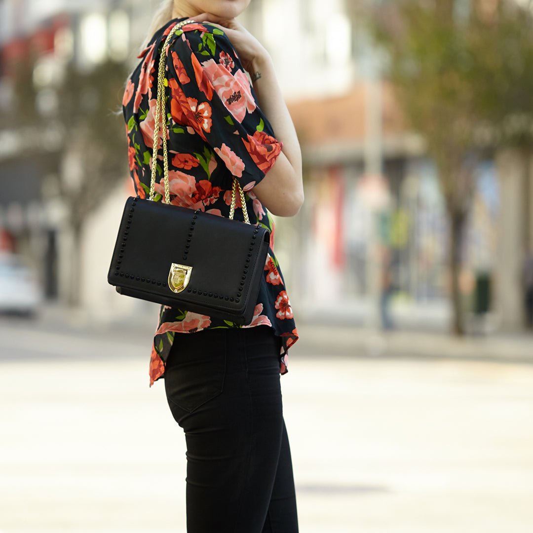 The Josie will take you through the seasons looking trés chic. Made with smooth leather, this trendy forward black leather crossbody bag with chain strap features decorative leather studs on its front flap. With a buckle closure, the fabric-lined interior includes a zip pocket, cell phone slip and 6 credit card slots. Its elegant light gold chain strap can be worn long as a fashion crossbody bag or doubled up for a shoulder purse style. The cute black leather chain bag can be worn day to night for all occasions.