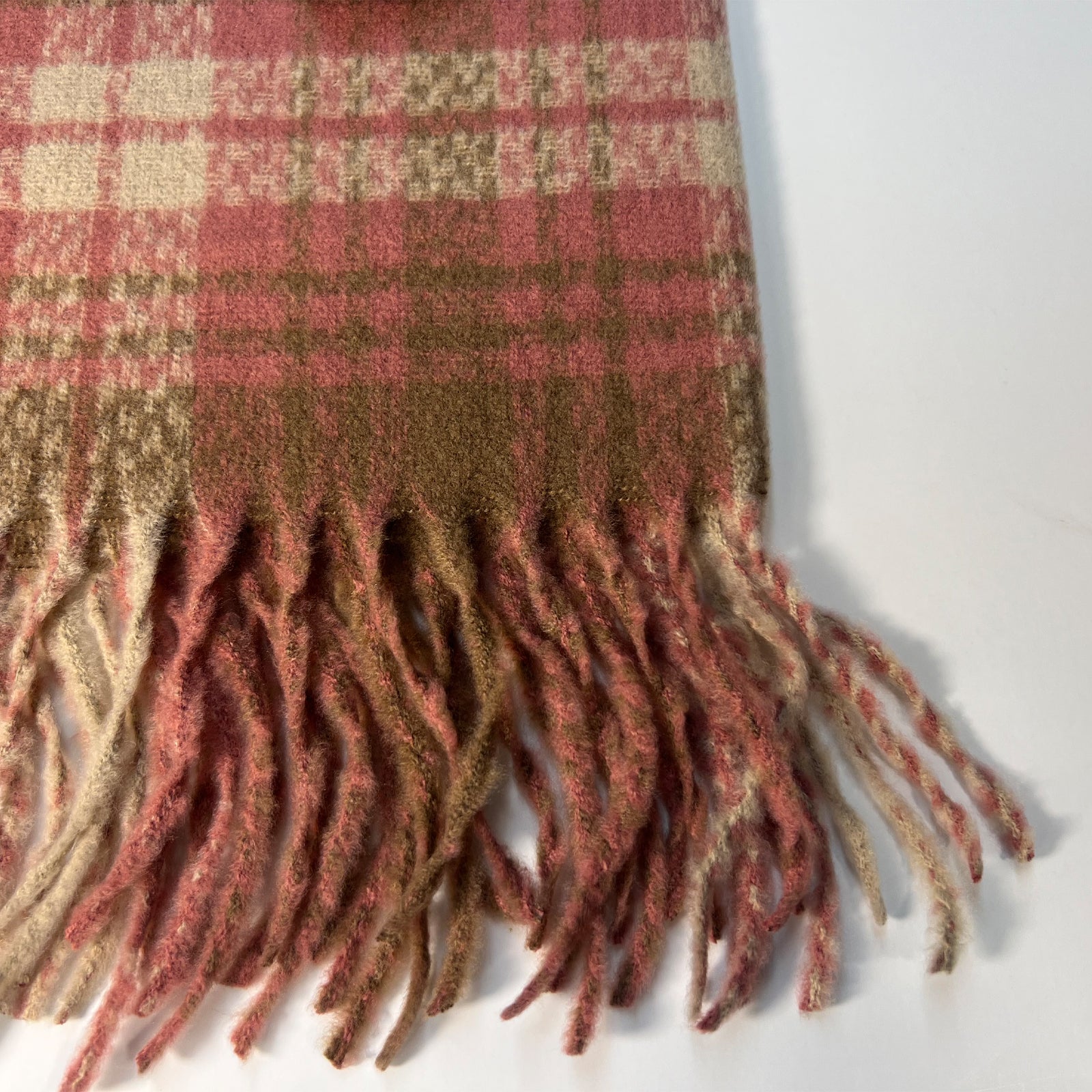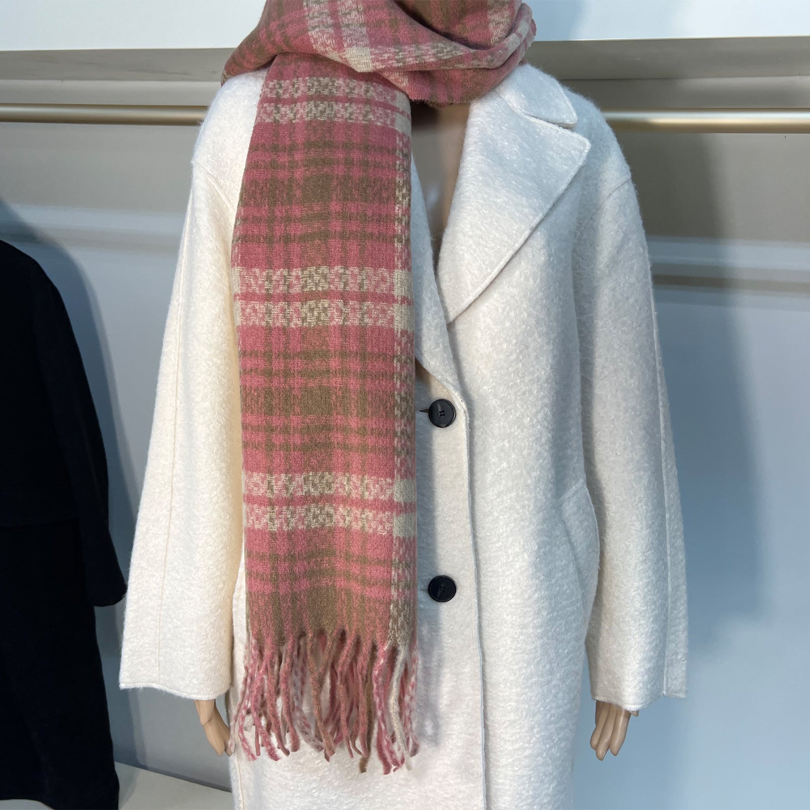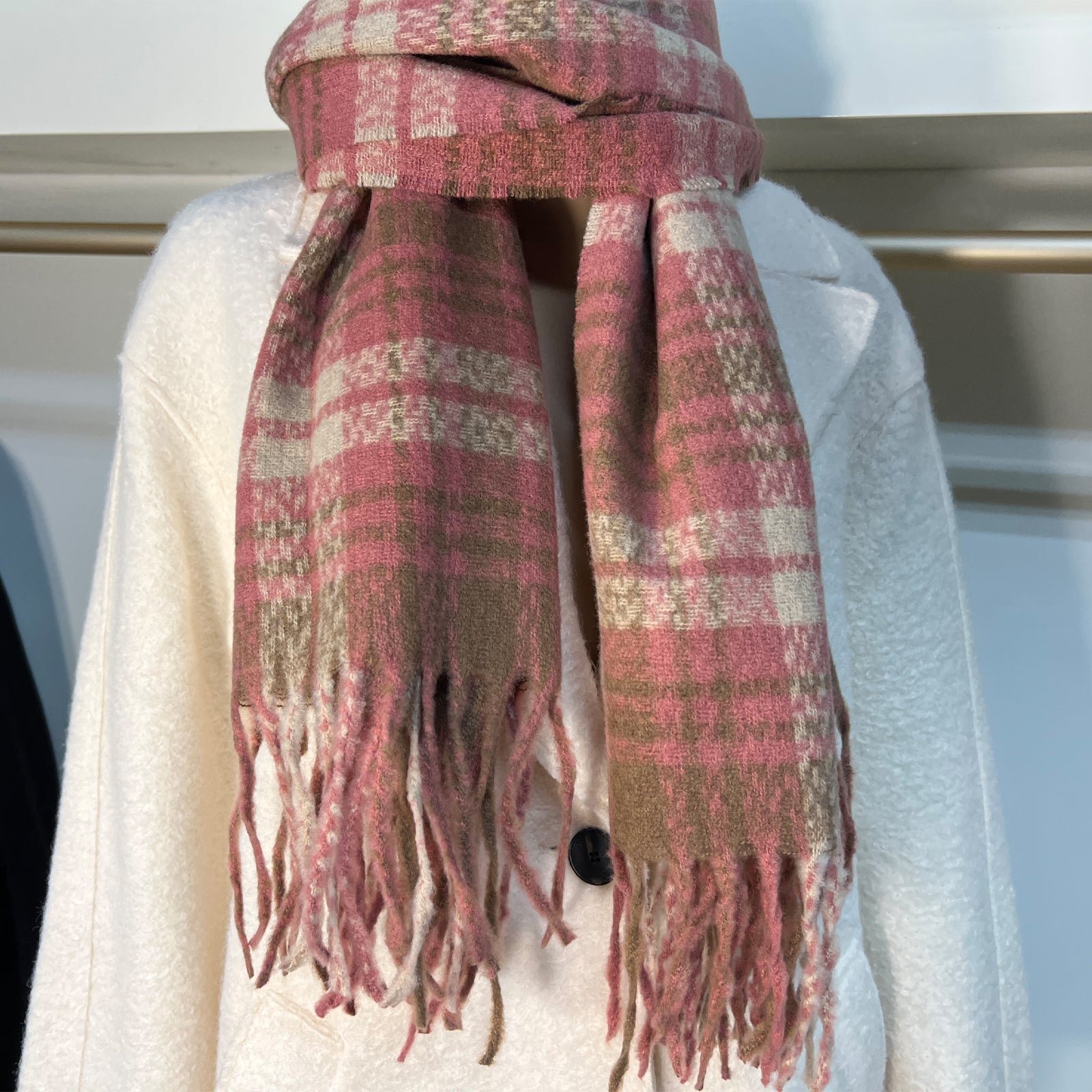 - Enhancing your winter wardrobe with a feminine pink plaid scarf.