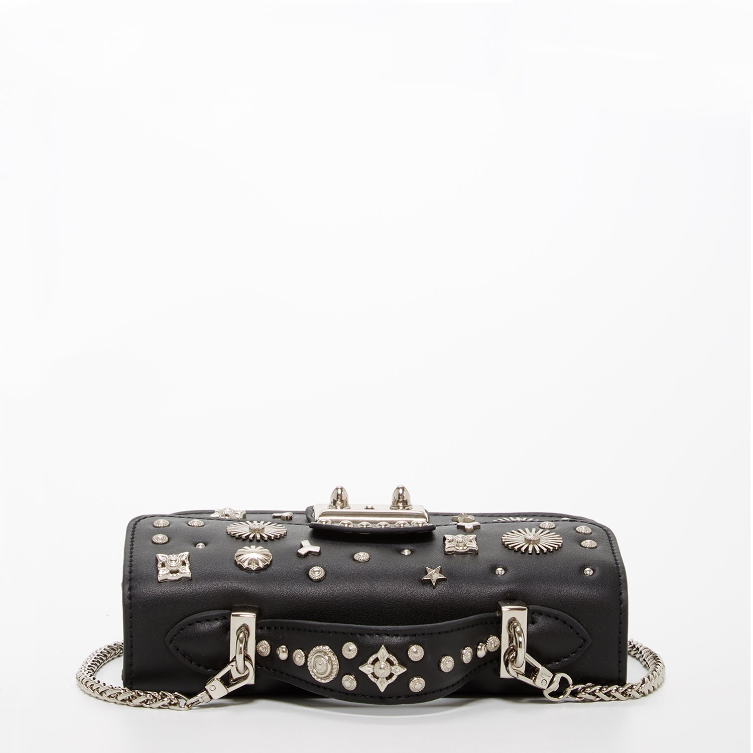 The stylish Hollywood is the perfect boxy mini purse with silver metal stud appliqués on the front of the bag and top handle. Secured by a polished silver metal push lock on the front flap, this structured black leather studded purse includes an interior zipped pocket and a slip pocket keeping all your essentials organized. Complimented with silver metal hardware, the cute Hollywood’s leather top handle, adjustable and removable silver chain strap allows you to wear this cool bag by its handle, over the shoulder, or as a chic crossbody style, especially for those times your hands are busy texting.