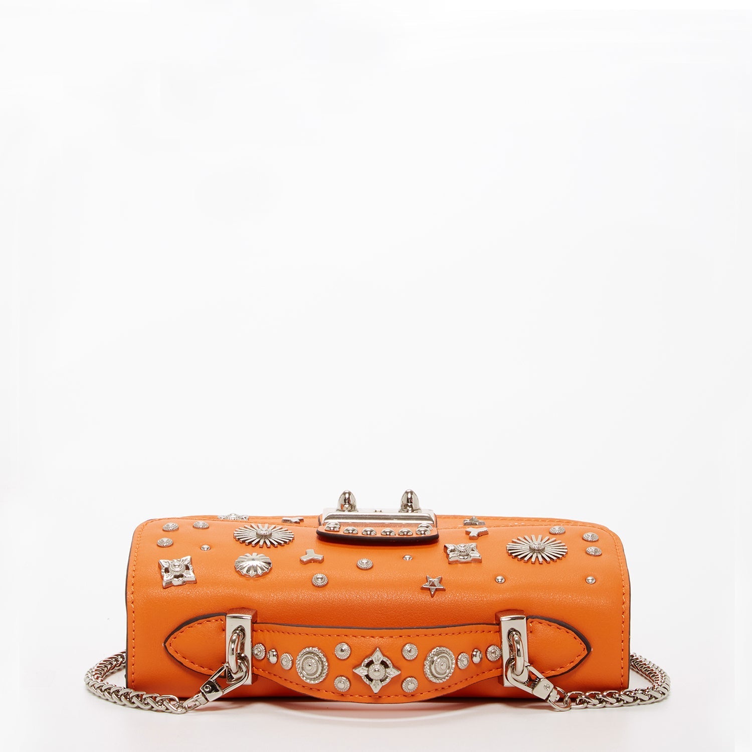 The trendy Hollywood is the perfect boxy mini purse with silver metal stud appliqués on the front of the bag and top handle. Secured by a polished silver metal push lock on the front flap, this structured orange studded leather crossbody bag includes an interior zipped pocket and a slip pocket keeping all your essentials organized. Complimented with quirky silver metal hardware, the Hollywood bag features a sleek leather top handle. Its polished accents add a touch of sophistication, making it perfect for evening outings or chic, stylish events. The adjustable and removable silver chain strap offers versatility, allowing you to wear it over the shoulder or as a crossbody. This practical design ensures hands-free convenience, especially when you're busy texting or on the go.