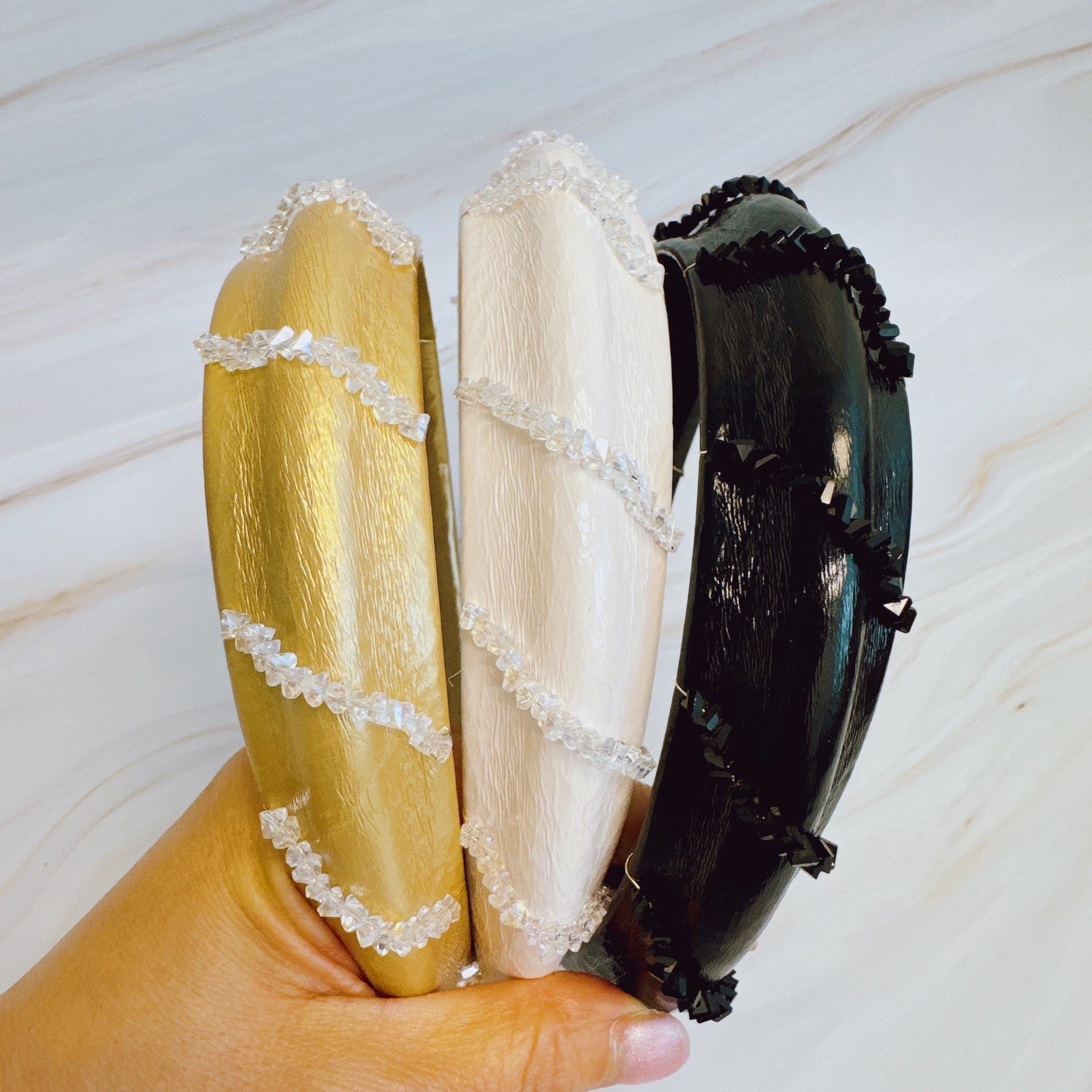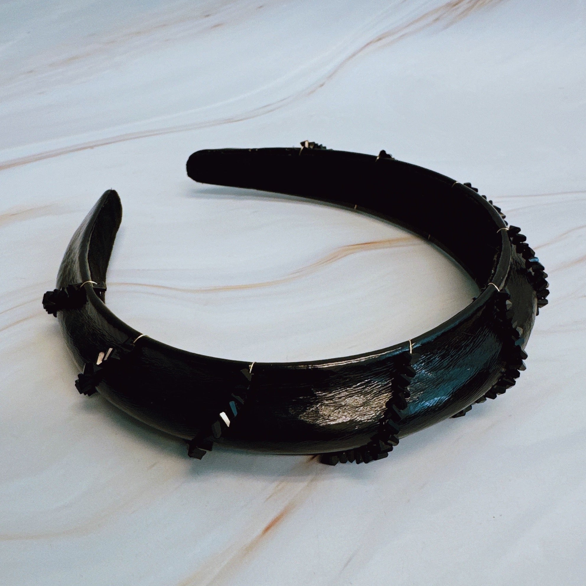 Add some sparkle and edge to your look with the Shine Swirl Patent Leather Headband. The volumized headband is adorned with swirling sparkly beads, while the textured patent leather-alike material adds a touch of glam. Perfect for adding a touch of glam to any outfit.