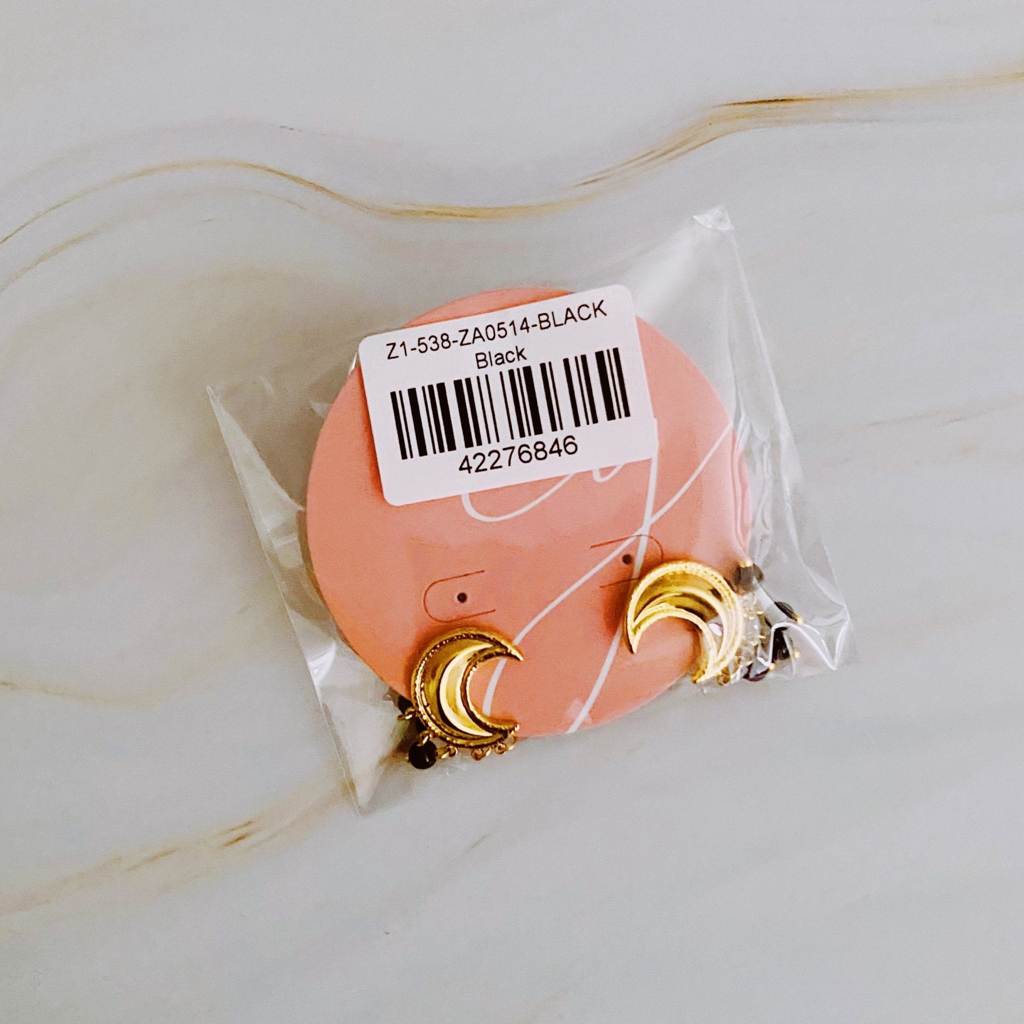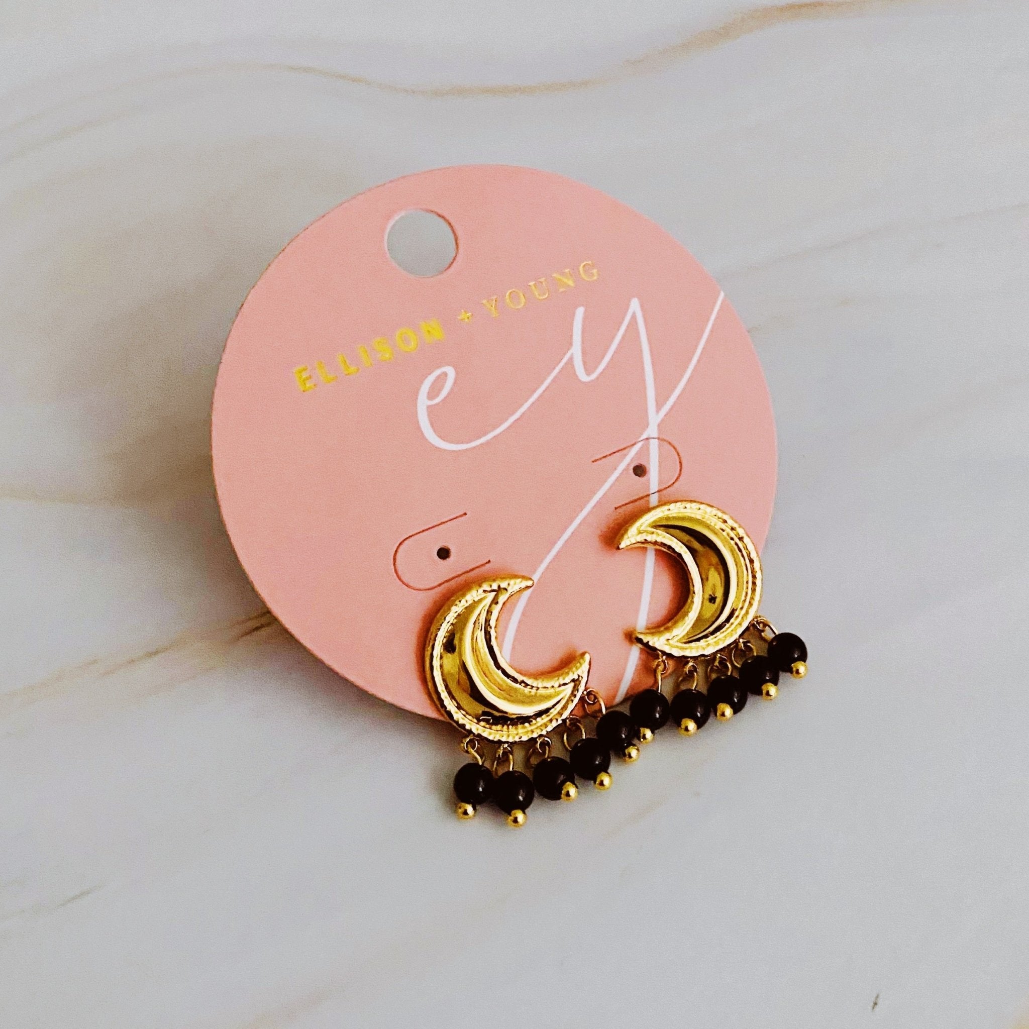 The Dangle Beads Crescent Earrings feature a crescent moon design with delicate beads dangling. A beautifully creative jewelry piece that effortlessly adds charm and elegance to any outfit.