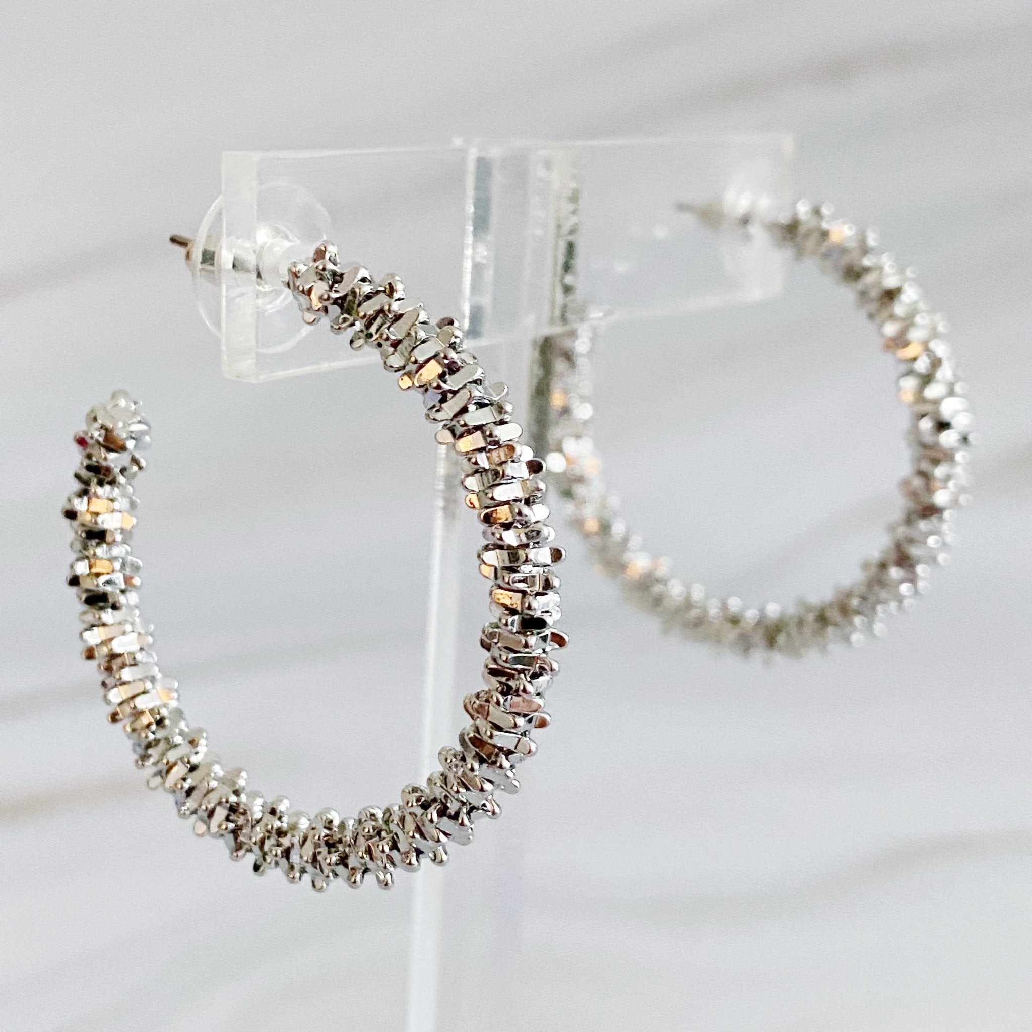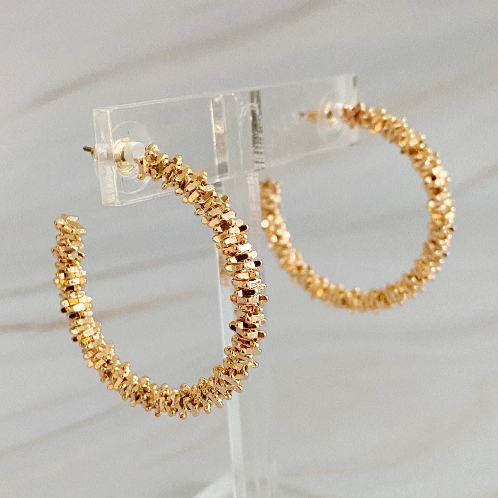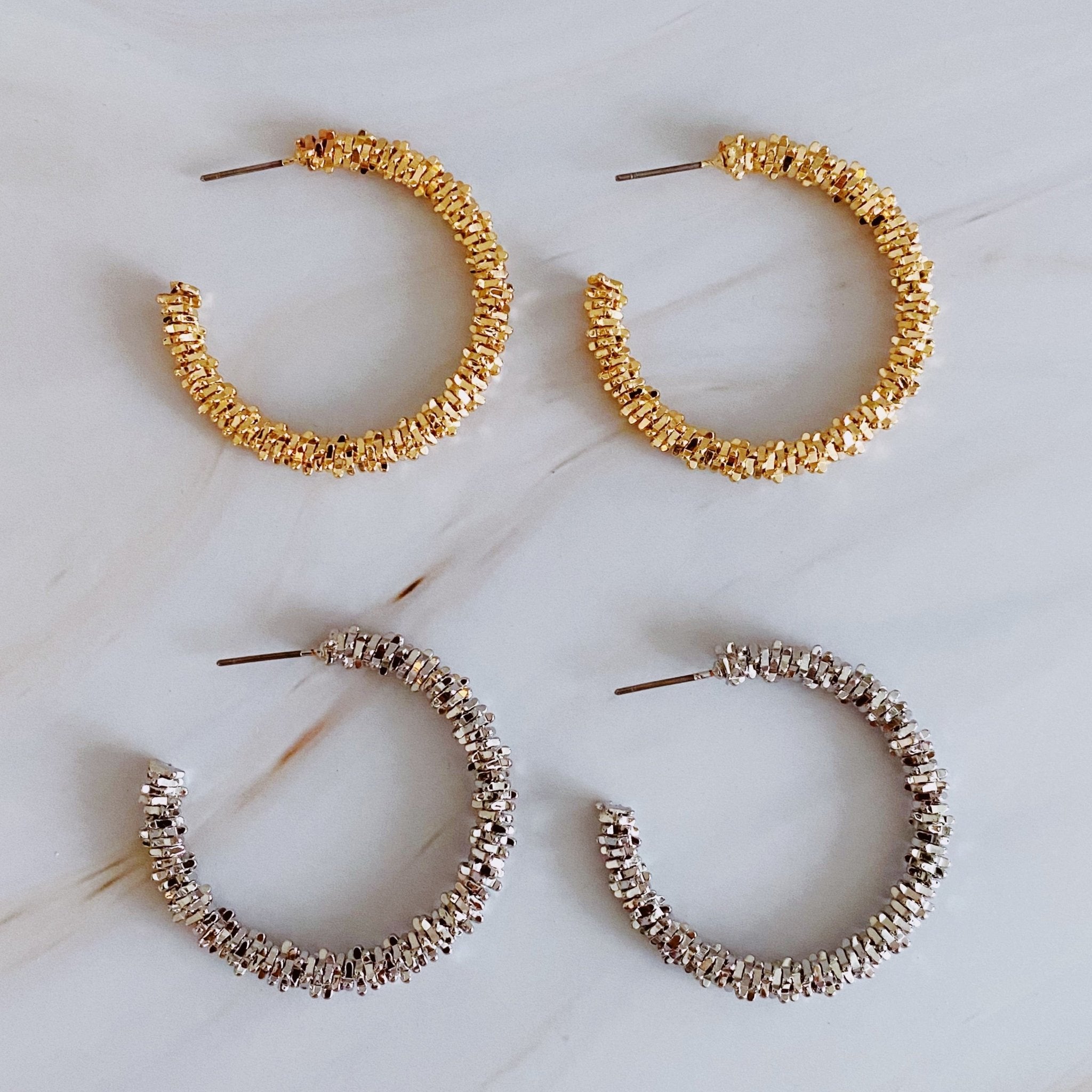 Crafted from small faceted metal pieces, the Golden Pebbles Hoop Earrings offer an elegant combination of modernity and muted sparkle. The light reflections of the metal pieces give the perfect pair of hoops an added shimmer to transition seamlessly from day to night looks.