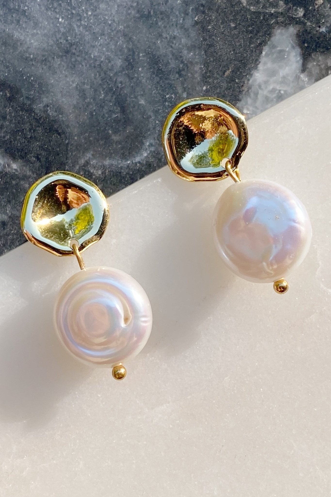 These Golden Shell Pearl Drop Earrings are an ideal blend of elegance and edginess. Featuring a trendy molten gold top and a classic shell button pearl dangle, these earrings are suitable for a variety of occasions, from formal to casual. Crafted with great attention to detail, they're sure to make a lasting impression.