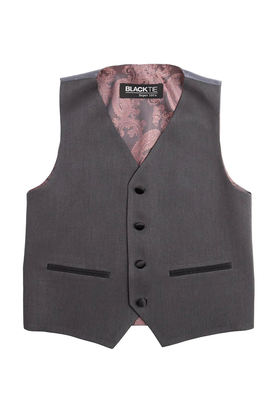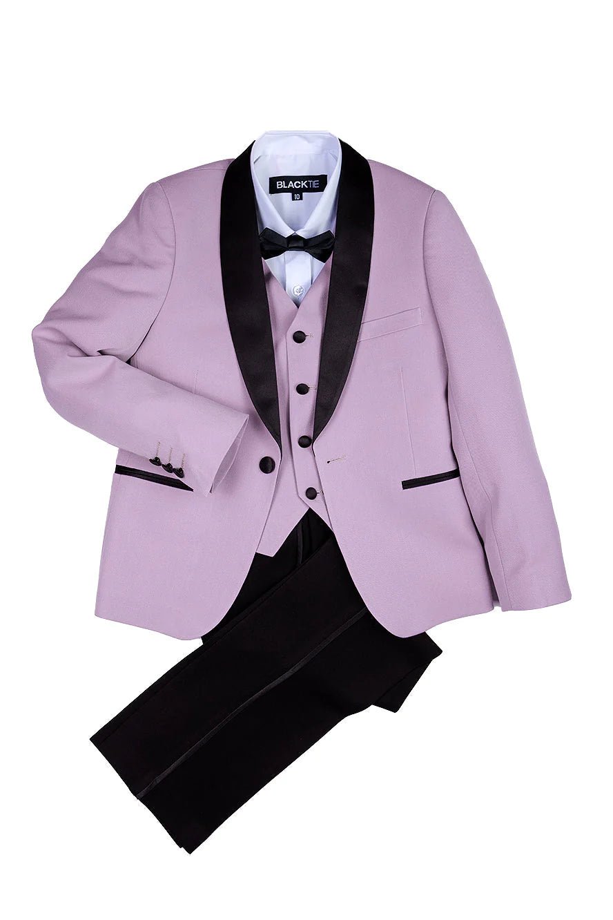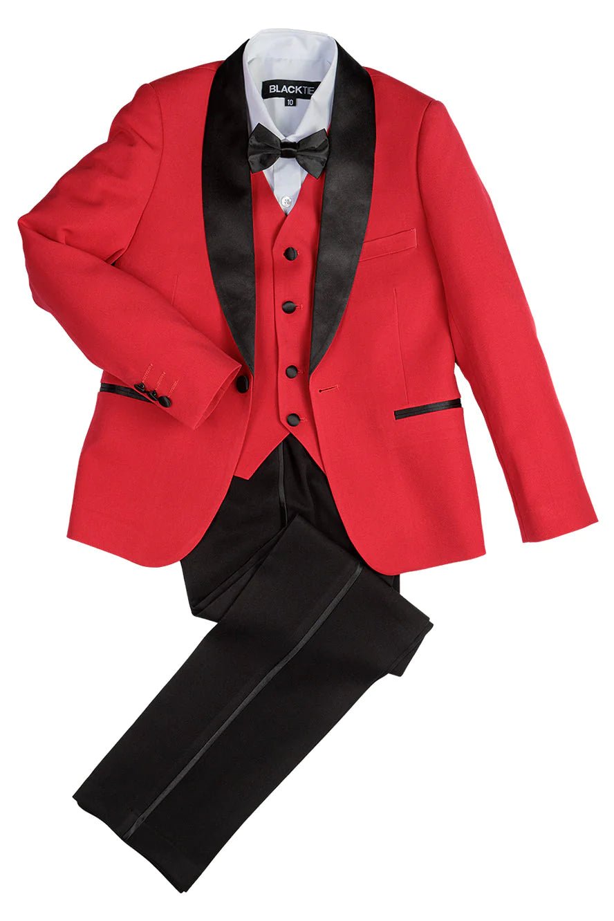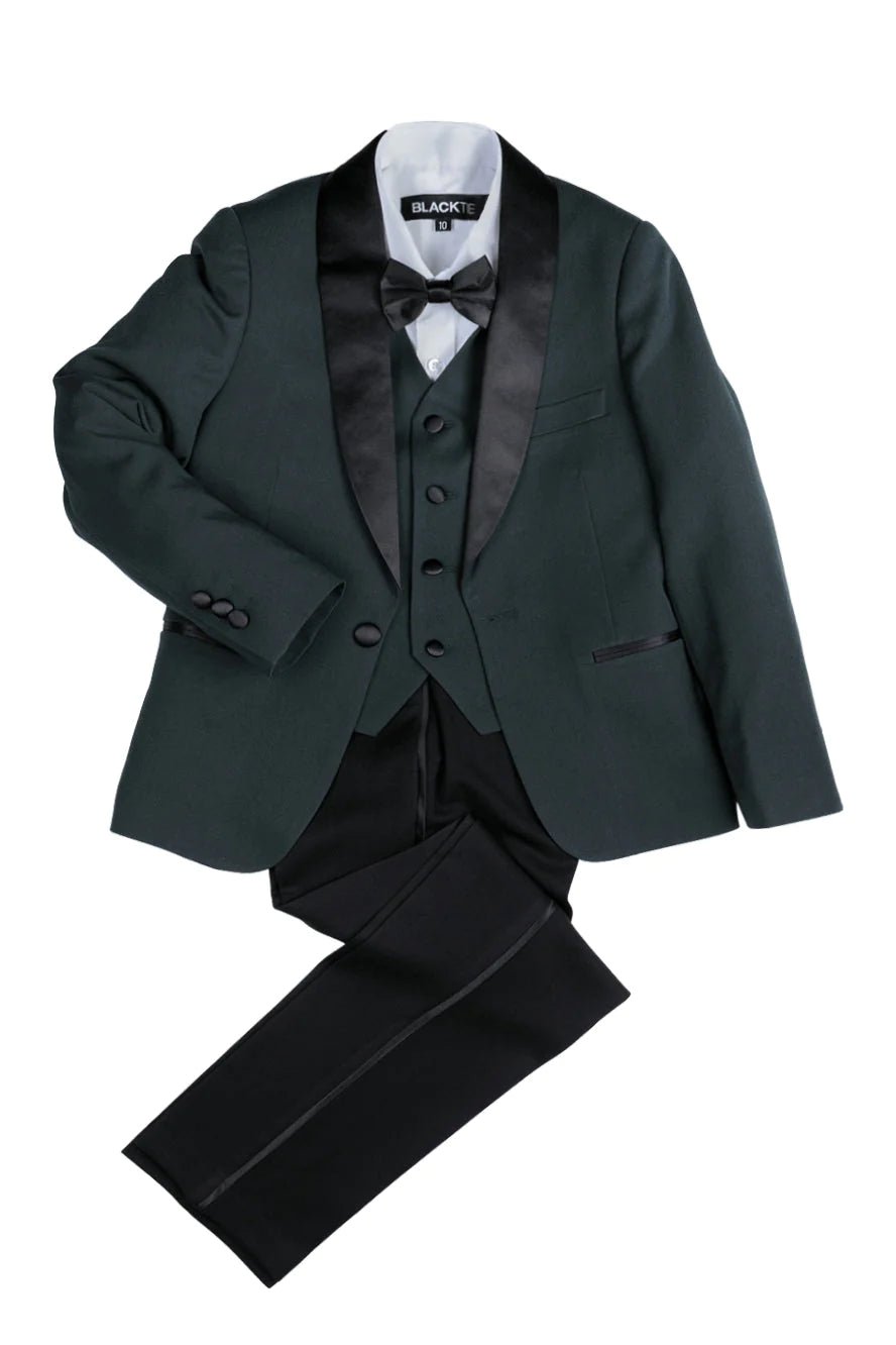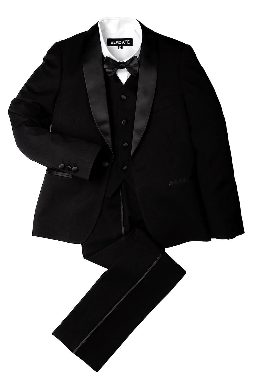 This 5-piece set includes the jacket, pants, shirt, vest and bow tie.