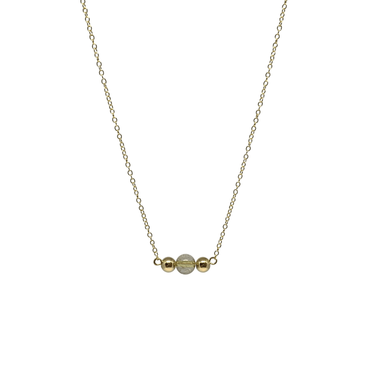 If shutdowns have taught us anything, it has been the importance of slowing down to enjoy all moments of life. That is why we decided to create this Be Present necklace to remind us of the importance of capturing beautiful present memories without constantly worrying about past or future. A beautiful gold rutilated quartz bead – with tiny hairs inside the bead representing the many joys and blessings of our current lives – is sandwiched between two gold beads each symbolizing past and future. The “present” bead is intentionally larger to create a magnifying effect to draw focus on the positive things we possess and are grateful for.