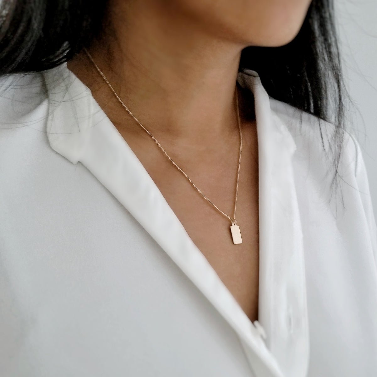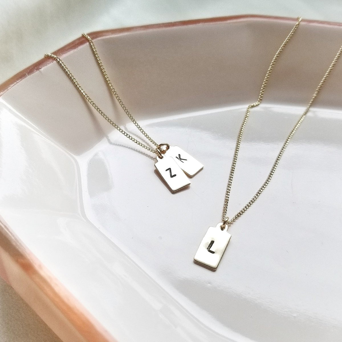 We love the simplicity of minimalist charms and these tags are no exception. Available either blank or stamped with an initial of your choice, these charms are a perfect piece for everyday wear and are available in 14KT gold-filled on 925 sterling silver!
