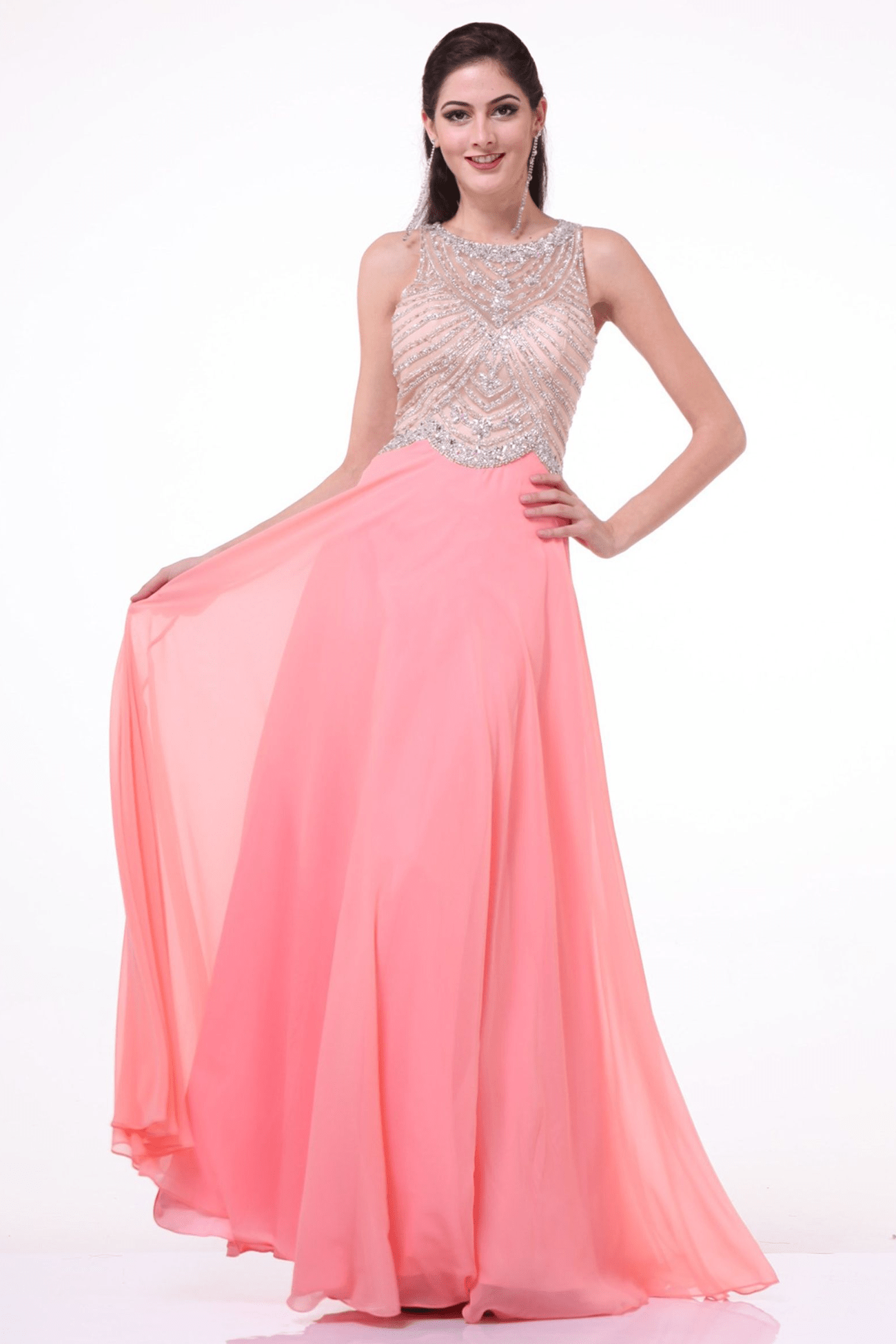 This sophisticated Long A-Line Skirt with an Illusion Jewel Neckline is perfect for your formal occasions. Its exquisite crystal encrusted bodice and glamorous illusion jewel neckline will make you shine. The A-line skirt falls softly to the floor with a sweeping train for an added dramatic effect.