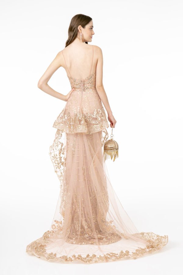 This stunning mesh A-line dress features sparkly jewels and glitter embellishment in splendid pattern all over the dress. Sheer bodice with V-neckline and spaghetti straps add a glam to your look, and wide open sheer back leads to an airy mesh tail which flares out at waist and outspreads on floor.