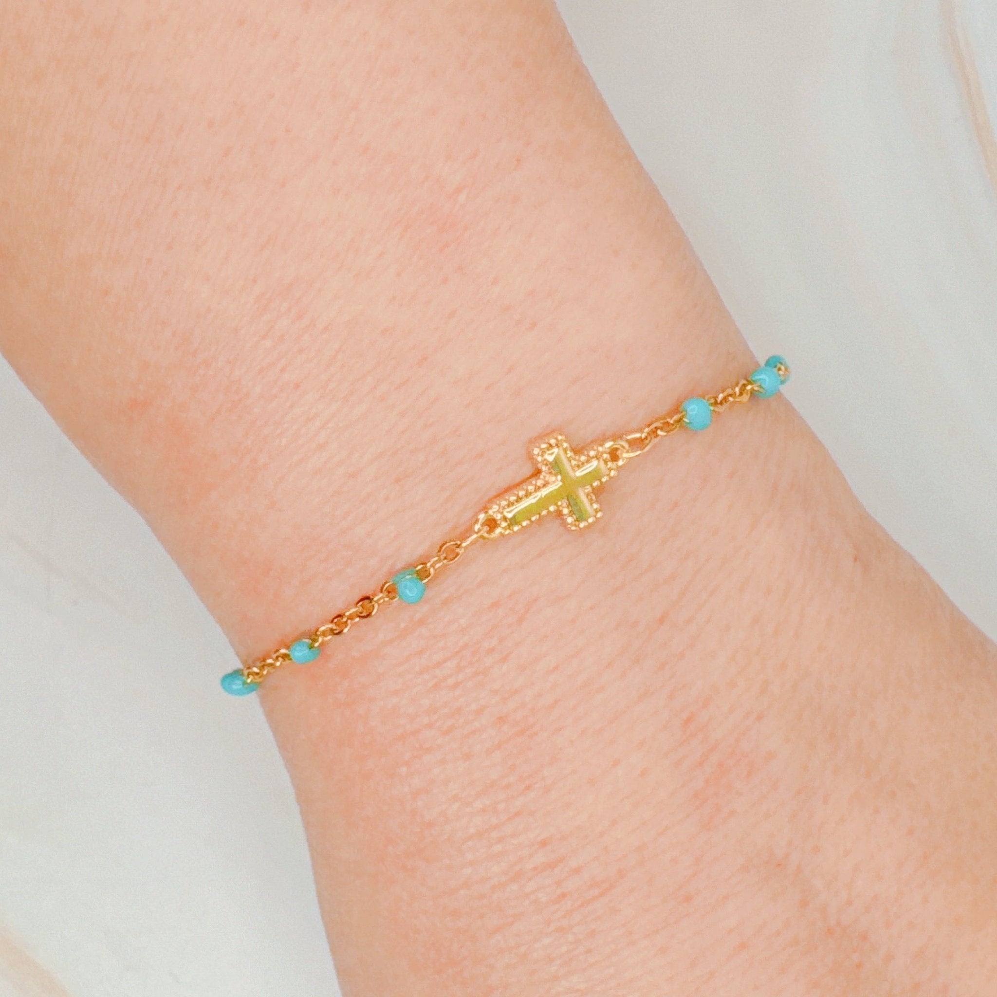 Add a touch of modern elegance to your wrist with this bracelet. The lovely coloring and stylish cross add a charming touch, while the dainty chain design gives a delicate and sophisticated look.