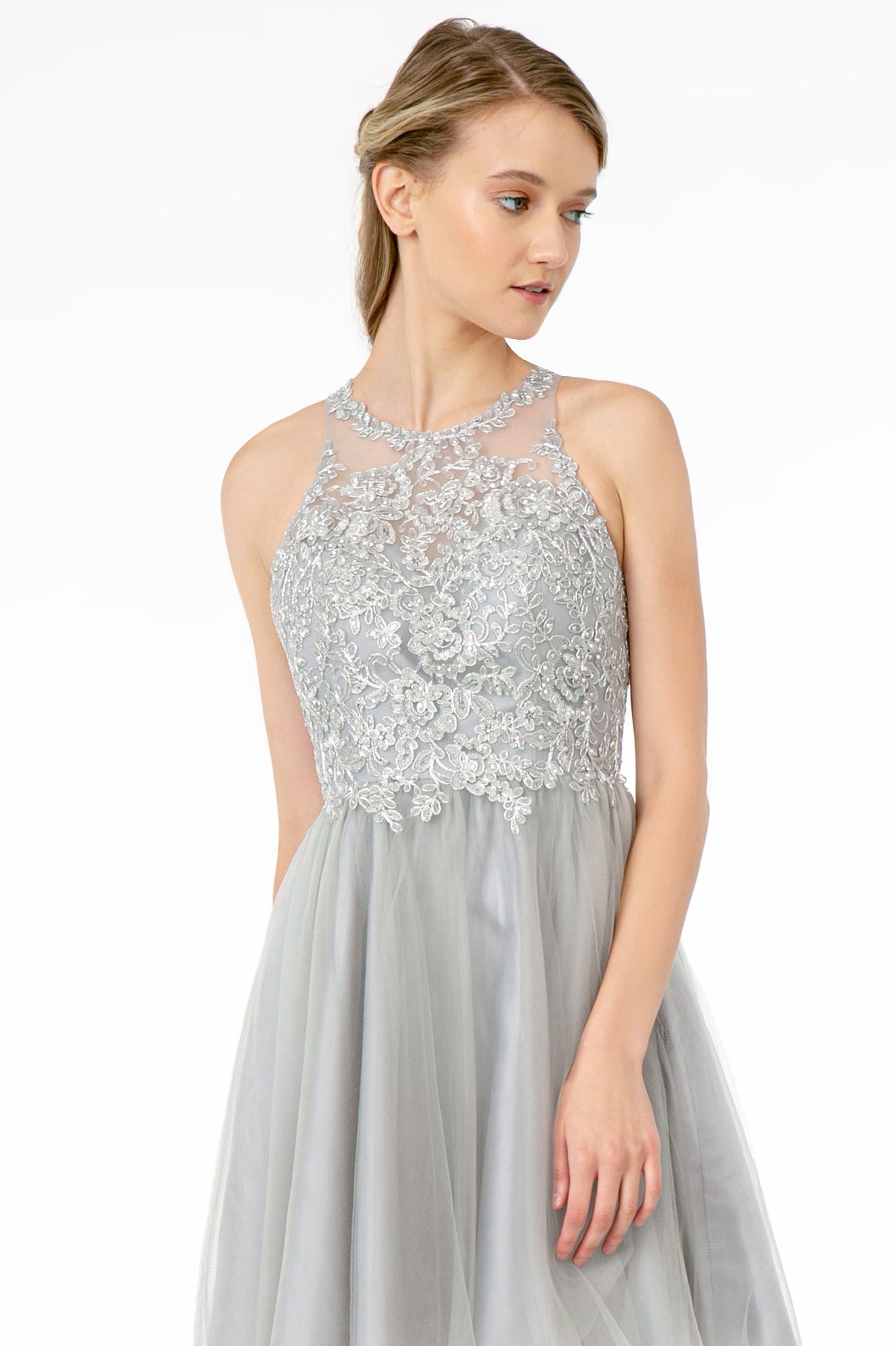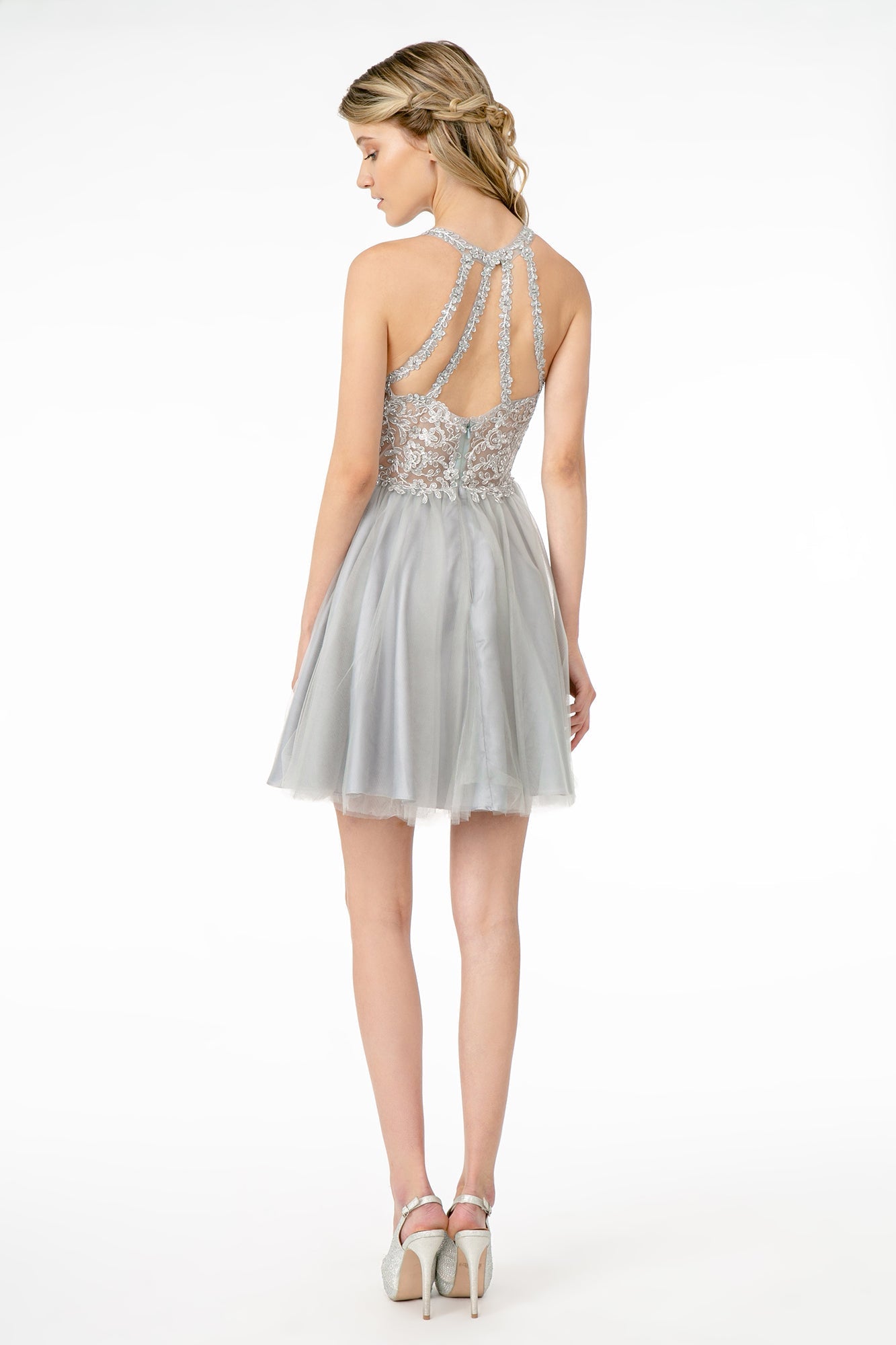 Jewel Embellished Embroidery Tulle Short Dress w/ Strap Back
