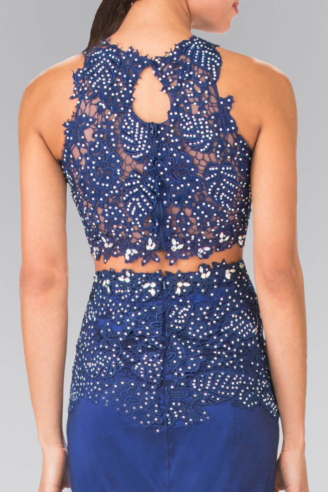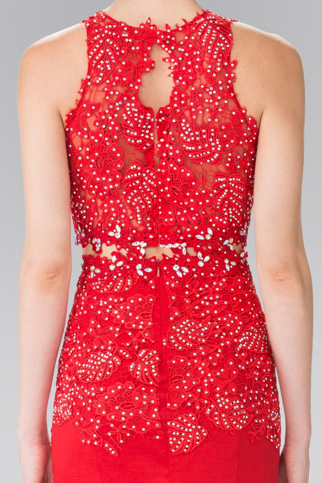Long two-piece taffeta dress, features a high neckline, sheer covered back with zipper, beaded decorations accompanying the lace overlay throughout the dress, plus it has a mermaid silhouette. This dress is a perfect choice for formal events as a pageant dress or prom dress, or as a red carpet dress. Available in red and royal blue