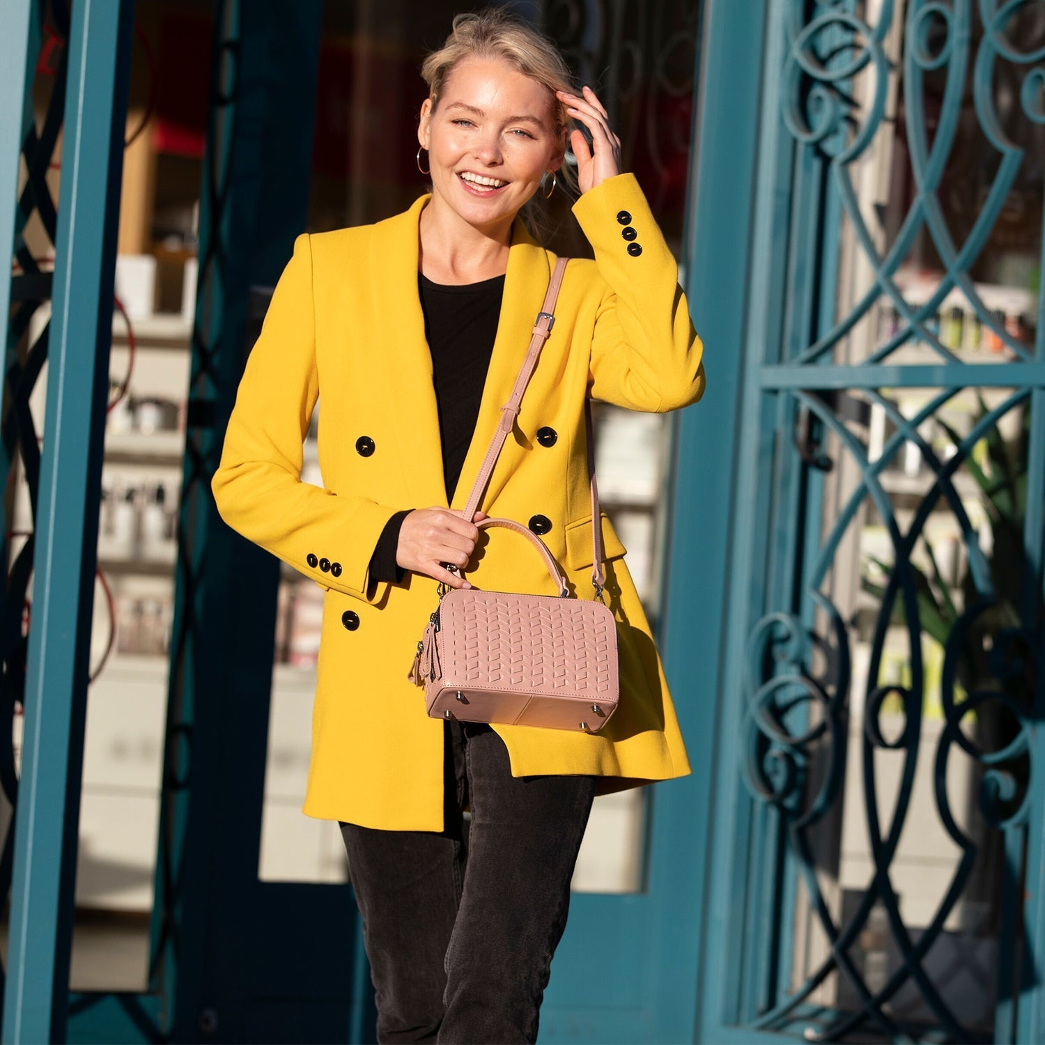 The classy boxy shape Kayla is expertly crafted from Italian leather and accented with a beautifully weaved leather in the front of the bag. This women's stylish pink woven leather bag will be a standout this season with its silver polished hardware. With the 2 large zipped compartments and 2 interior zipped pockets will surprise you by how much it can fit. This chic top handle designer bag comes with an adjustable crossbody shoulder strap especially for those times your hands are busy texting.